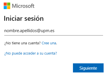 A screen will appear asking you to sign in. Enter your institutional email address (name.surname@upm.es, name.surname@fgupm.es, etc.) and click "Next".