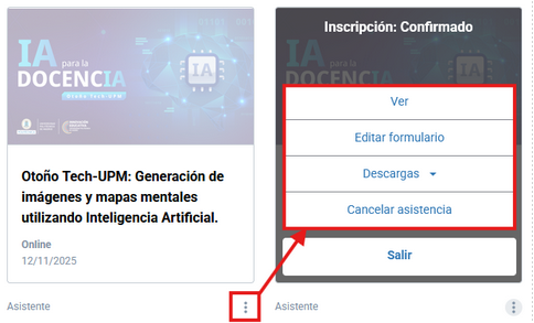 When you log in to the Eventos UPM platform with your user account, you'll see upcoming and past events. Clicking on "More options" for an event will display various options such as View, Edit form, Downloads tickets or certificates, Cancel attending, or Transfer registration.