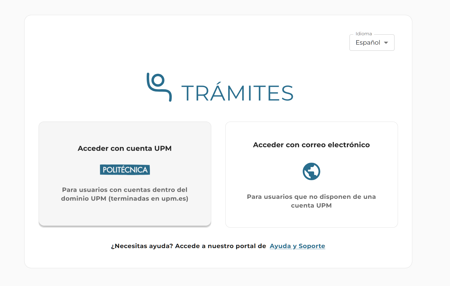 El acceso al portal puede hacerse con la cuenta de servicios UPM o, si no dispone dela misma, con una cuenta externa de correo electrónico.