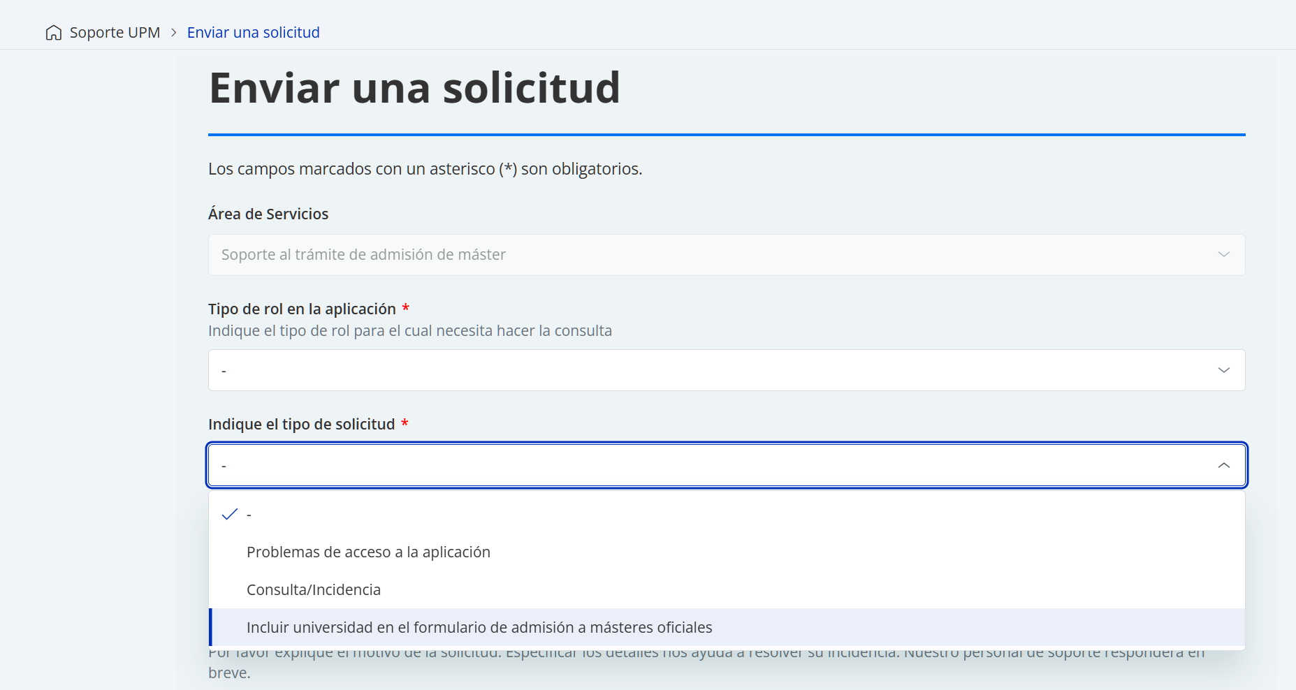 A partir de esa información el equipo de soporte hará las comprobaciones oportunas, incluirá tu universidad en el sistema, y te contestará vía email para que puedas finalizar tu solicitud de admisión a máster oficial.